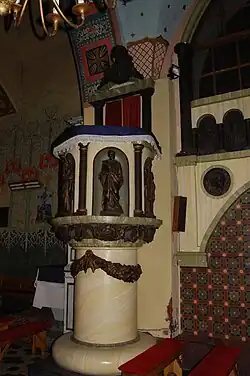 Ogrom prac związany z przebudową świątyni był na tyle długi, iż młodzi małżonkowie zaaklimatyzowali się na Kujawach i osiedli na stałe. Początkowo mieszkali w pałacu Wodzińskich (obecnie nieistniejący pozostał jedynie zabytkowy park), gdzie artysta miał swoją pracownię. Glinę potrzebną do prac dostarczono z pobliskiego jeziora Goszczewskiego. Bębnowski wykonał w kościele zdobienie ołtarza, chrzcielnicy, loży kolatorskiej, chóru i ambonę. Na szczególną uwagę zasługuje chrzcielnica przedstawiająca scenę wypędzenia z raju. W rzeźbionych postaciach twórca utrwalał twarze miejscowych ludzi np. w piecie do postaci Marii pozowała pokojówka z pałacu Wodzińskich Wiktoria Kostecka a do postaci Chrystusa stajenny Franciszek Kozłowski. Oprócz tworzenia wystroju Służewskiej świątyni Bębnowski zajmował się także sztuką użytkową. Wspólnie ze swoim mecenasem Leonem Wodzińskim otworzyli w 1903 r. wytwórnię ceramiki. Artysta projektował różnego rodzaju przedmioty, które później wykonywano w wytwórni.