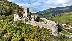 Położone na lewym brzegu Dunaju średniowieczne Dürnstein nazywane jest „perłą Wachau”[21]. Nad miasteczkiem góruje zamek Dürnstein, z którym związana jest historia króla angielskiego Ryszarda Lwie Serce, który sprofanował flagę Babenbergów[22]. Powracający z trzeciej wyprawy krzyżowej przez Austrię Ryszard Lwie Serce został pojmany z rozkazu Leopolda V Babenberga i uwięziony na zamku Dürnstein od grudnia 1192 roku do lutego 1194 roku; następnie został oddany w ręce cesarza Henryka VI Hohenstauf[23][24]. Po zapłaceniu okupu 35 tys. w srebrze król został uwolniony, a pieniądze pozwoliły na sfinansowanie wielkich projektów budowlanych, m.in. w Wiedniu[22]. Zamek został prawie doszczętnie zniszczony podczas najazdu wojsk szwedzkich w XVII wieku[25].