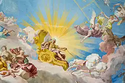 - Wnętrza kościoła zdobione freskami Johanna Michaela Rottmayra[13]