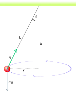 {\displaystyle T=2\pi {\sqrt {{\frac {r}{\sin \theta }}{\frac {\cos \theta }{g}}}}=2\pi {\sqrt {\frac {L\cos \theta }{g}}}}