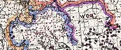 Zasięg dialektu wysokopruskiego z podziałem na gwary Oberländisch i Breslausch (na podstawie różnic: wor- i woa-).