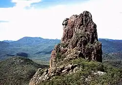 ![]() Zachodnia część Warrumbungle Range z formacją skalną Breadknife | |