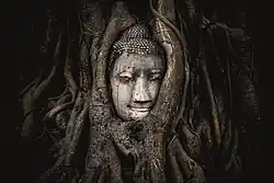 Najbardziej charakterystycznym miejscem świątyni jest kamienna rzeźba głowy Buddy obrośnięta przez korzenie drzewa[2].