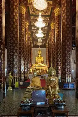 Główny budynek świątyni wyróżnia się pięknie rzeźbionym, drewnianym sufitem przedstawiającym wyobrażenie buddyjskiego nieba. Wewnątrz świątyni znajduje się również 6-metrowy posąg siedzącego Buddy[1].