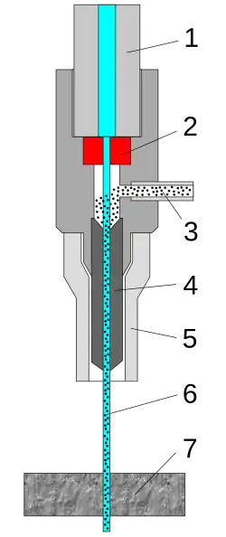 Technologia abrasive water jet (AWJ) używa strugi wody do przyspieszenia ziaren ścierniwa (najczęściej jest nim granat)[2]. Woda po przejściu przez dyszę wodną powoduje inżektorowe zasysanie ścierniwa do komory miksującej. Mieszanina wody i ścierniwa kierowana jest następnie do dyszy hydro-ściernej (mixing tube) w celu jej uformowania i ustabilizowania. Powstająca w ten sposób struga posiada wystarczającą ilość energii aby przeciąć najtwardsze materiały. Prędkość takiej strugi, u wylotu z dyszy, przekracza 300 m/s.