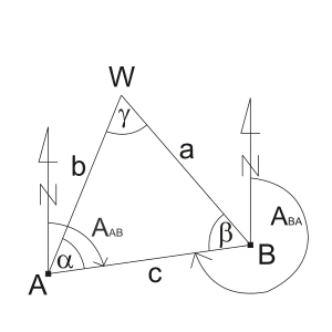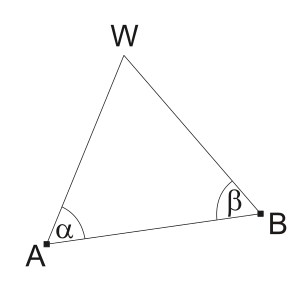 Danymi są dwa kąty poziome α i β pomierzone w trójkącie ABW na stanowiskach A i B, będących punktami o znanych współrzędnych.