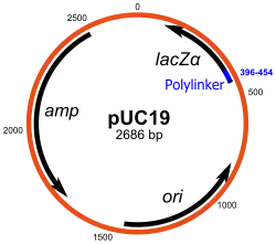 Do najpopularniejszych wektorów plazmidowych należą wektory z serii pUC. Zostały one skonstruowane na podstawie plazmidu pBR322, a ten z kolei powstał przez ligację fragmentów restrykcyjnych z trzech naturalnie występujących plazmidów Escherichia coli (R1, R6.5 i pMB1). Przykładowo plazmid pUC19 ma rozmiar 2,7 kpz, posiada miejsce startu replikacji (ori) oraz 2 geny markerowe: gen odporności na ampicylinę (amp) oraz fragment genu kodującego enzym β-galaktozydazę (lacZα)[17].