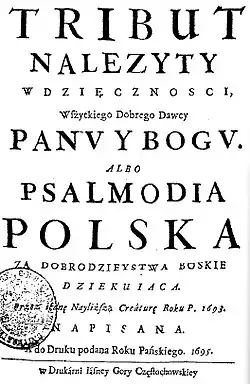 - Psalmodia polska, Trybut należyty wdzięczności wszystkiego dobrego Dawcy, Panu i Bogu albo Psalmodia polska za dobrodziejstwa Boskie dziękująca 1695.