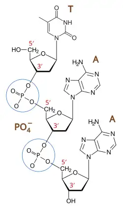 Wiązanie fosfodiestrowe w kwasach nukleinowych łączy kolejne nukleotydy w łańcuchu DNA i RNA[1], poprzez połączenie z grupą fosforanową piątego atomu węgla w deoksyrybozie jednego nukleotydu z trzecim atomem węgla deoksyrybozy drugiego nukleotydu. Enzymy hydrolizujące internukleotydowe wiązanie fosfodiestrowe to nukleazy.