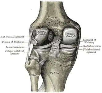 U człowieka przyczepia się do nadkłykcia bocznego kości udowej, biegnie ku dołowi, kończąc się przyczepem do powierzchni bocznej głowy strzałki. Od torebki stawowej oddziela go tkanka tłuszczowa, samo więzadło nie jest zrośnięte z torebką. Jego funkcją jest usztywnienie stawu w pozycji wyprostnej[1].