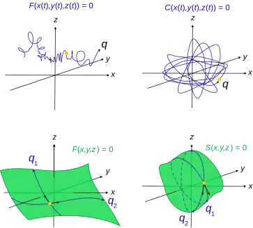 - holonomiczne (geometryczne, kinematyczne całkowalne) – więzy te ograniczają tylko położenie punktu (układu); można opisać je całkowalnymi równaniami różniczkowymi:
