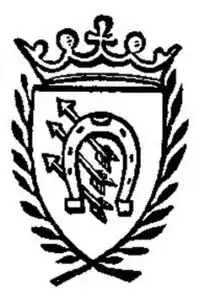 W polu srebrna podkowa barkiem do góry postawiona, podkowa przeszyta na ukos trzema srebrnymi strzałami, strzały skierowane grotami do góry