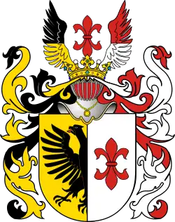 Klejnot: lilia jak w godle między dwoma skrzydłami orlimi - prawym w pas czarno-złotym, lewym w pas czerwono-srebrnym.
