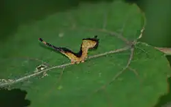 Gąsienica ma tło ciała ubarwione zielono z czarną głową, jednak przed przepoczwarczeniem jego barwa zmienia się na ciemnobrudnofioletową. Różnią się od gąsienic widłogonki siwicy silniej wyciętym po bokach mięsistym siodłem, obecnością białej plamy na boku ciała oraz czarnym ubarwieniem wici wypuszczanych z widełek na końcu odwłoka[5].