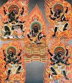 W centrum według Ninnō-kyō Mandara znajduje się Aczalanatha (skt. Ācala), który odpowiada Wajroczanie. Na północy znajduje się Wadżrajaksza (Wadżrapani), odpowiadający Amoghasiddhi. Na zachodzie znajduje się Jamantaka, odpowiadający Amitabhie. Na wschodzie znajduje się Trailokjawidżaja, odpowiadający Akszobhii. Na południu znajduje się Kuṇḍali, odpowiadający Ratnasambhawie[2].