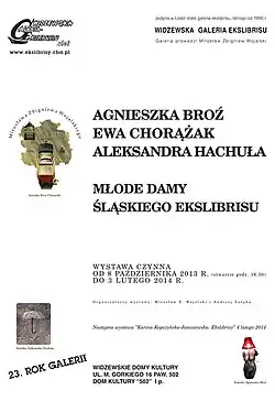 82. „Agnieszka Broź, Ewa Chorążak, Aleksandra Hachuła. Młode damy śląskiego ekslibrisu”. Wystawa otwarta 8 października 2013 r. i czynna do 4 maja 2014 r. Katalog (ISBN 978-83-86699-73-5) przygotował Mirosław Zbigniew Wojalski i jest jego sponsorem. Otwarcie zaszczyciły swoją obecnością autorki.