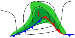 • linia pomarańczowa – front ciepły, widzialność słaba,