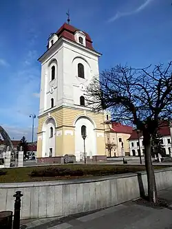Na wieży znajdują się trzy dzwony. Największy z nich, imieniem Józef Kalasanty, odlany w 1780 r. w Bańskiej Szczawnicy, waży 980 kg. Pozostałe dwa zawieszono w 1924 r.[1] Większy z napisem Święty Florianie, chroń nas od ognia waży 580 kg, ostatni, mniejszy, waży 358 kg.