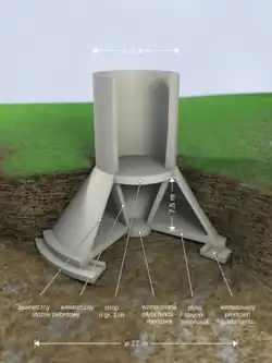 Podstawa fundamentu w kształcie pierścienia o szerokości 3,25 m i średnicy 27 m jest wzmocniona pękiem naprężonych stalowych prętów, lekko zabetonowanych w celu ochrony przed wodami gruntowymi. Bez tego naprężenia ciężar wieży rozsadziłby pierścień fundamentu[47].