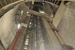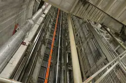 Sporym wyzwaniem okazała się budowa wind. W dzień, ze względu na rozszerzalność temperaturową kosz wieży przemieszczał się do 17 centymetrów na stronę zacienioną. Uniemożliwiało to właściwe wypionowanie prowadnic w szybach wind. Pionowanie musiało przebiegać nocą, a pozostałe prace trwały w dzień. Do czasu ukończenia wind materiał budowlany i pracownicy byli przewożeni zwykłym dźwigiem towarowym. 31 grudnia 1955 w ten sposób prezydent miasta Klett z żoną zapoznał się z postępem budowy. 27 stycznia 1956 pracownicy budowlani podjęli krótki, półtoragodzinny protest przeciw zmuszaniu ich do korzystania ze schodów, gdy „Władcy Nadajników“ (niem. „Herren der Sendertechnik“) mogą wygodnie wjeżdżać zewnętrznym wyciągiem z gondolą[19].
