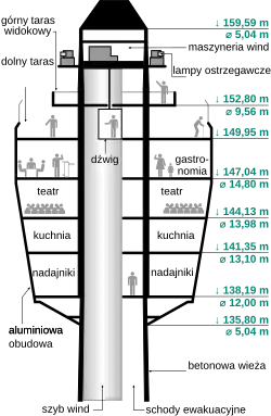 Cylindryczna wieża zwęża się parabolicznie ku górze. Przy wejściu średnica budowli wynosi 10,8 metra, a u podstawy kosza 5,04 m. Minimalna średnica wynikała z konieczności zmieszczenia wewnątrz dwóch wind i ewakuacyjnej klatki schodowej[1]. Ku wierzchołkowi zmniejsza się również grubość ścian: przy ziemi są grube na 60 centymetrów, a u podstawy kosza na 19 cm. Schody ewakuacyjne liczą 762 stopnie[48]. Cylindryczny przekrój wynika z korzystnego współczynnika oporu i w połączeniu z gładkim pokryciem ścian obniża wrażliwość budowli na wiatr. Żelbetowa rura cechuje się wysokim współczynnikiem tłumienia: drganie spowodowane przez poryw wiatru szybko ulega wygaszeniu. Energia wiatru jest wytracana poprzez naginanie zbrojeń od strony nawietrznej, które są elastyczniejsze niż beton[49]. Ściany cokołu są usztywnione poprzecznie co 10 metrów, co jest widoczne również z zewnątrz. Co druga z wręg mieści podest przy schodach ewakuacyjnych. Wzmocnienia są połączone z pięcioma betonowymi kolumnami, na których umieszczono prowadnice wind i instalacje[45].