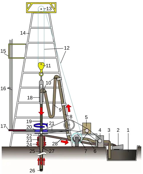 - Głowica płuczkowa (na nowszych wieżach zastępowane przez napęd na końcu przewodu wiertniczego – Top drive