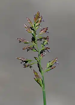 - Wiecha od 3 do 8 cm, ścieśniona, z szorstkimi, sztywnymi i krótkimi gałązkami. Plewka dolna naga, jedynie w nasadzie ma wełniste włoski. Kłoski od 3 do 8 mm długości, 3 do 10 kwiatowe.
