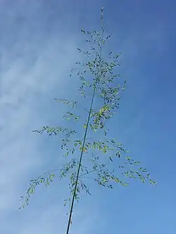 - Kwiatostan w postaci długiej na 15–20 cm, rozpierzchłej wiechy. Drobne, jajowate kłoski z 3–4 najczęściej ciemnofioletowymi kwiatkami.