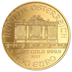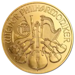 - ↑ Vienna Philharmonic 1 Ounce fine gold (999.9) [online], www.muenzeoesterreich.at [dostęp 2021-02-09] (ang.).