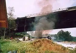26 sierpnia 2004 roku doszło do zderzenia samochodu osobowego z cysterną przewożącą 32 tysiące litrów oleju napędowego, w wyniku czego cysterna zapaliła się. Kierowca cysterny zginął na miejscu. Bariery energochłonne znajdujące się na moście były zaprojektowane jedynie do „zatrzymania” pojazdów o masie nieprzekraczającej 13 ton i okazały się zbyt słabe, aby uchronić cysternę przed wypadnięciem z mostu. W wyniku powstałego pożaru konstrukcja mostu uległa poważnemu uszkodzeniu i została zamknięta dla ruchu. W okresie od 26 sierpnia do 7 października 2004 roku wykonano prowizoryczne prace naprawcze[2]. Wypadek ten okazał się najdroższym zdarzeniem drogowym w Niemczech. Całkowity koszt remontu wyniósł 30 milionów euro[3].