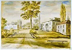 Po prawej stronie pałacyku stała duża, piętrowa oficyna (prawdopodobnie większa niż na rysunku Ordy). Budynek ten pod koniec XIX wieku został znacznie przedłużony. Po lewej stronie, w pewnej odległości od domu stała oranżeria, w której hodowano wiele rzadkich i egzotycznych roślin. Między pałacem, oficyną i oranżerią rozciągał się wielki kolisty gazon[3].