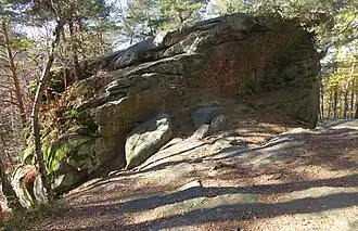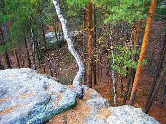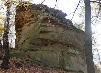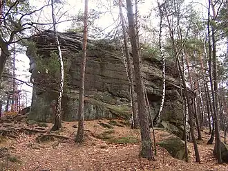 Wielki Kamień to najwyżej położona piaskowcowa skała. Znajduje się na skalnej platformie o powierzchni około 120 m². Skała ma kształt baszty, wysokość ok. 10 m i długość 16 m. Jej ściany są pionowe, lub przewieszone. Tylko od wschodniej strony tworzy stopnie, po których bez większych trudności można wspiąć się na jej płaski niemal wierzchołek tworzący platformę. Na kamieniu tym w wydawałoby się zupełnie nie nadającym się dla roślin miejscu rosną młode drzewka sosny i brzozy. Wierzchołkowa płyta kamienia zryta jest licznymi wykutych w niej napisami przez domorosłych „rzeźbiarzy”, a boki pokryte „graffiti”[1].
