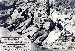 - ↑ Profesor Marjorie Housepian Dobkin, w kronice Smyrna 1922: The Destruction of a City, cytuje m.in. wicekonsula USA w Smyrnie oraz innych naocznych świadków, spośród personelu konsulatu, relacjonujących „Turkish soldiers often directed by officers. Throwing petroleum in the streets and houses – tureccy żołnierze, często kierowani przez oficerów, rozlewali ropę naftową na ulicach i domach”