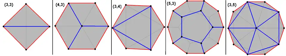 Niech wielościan powstaje przez odwzajemnienie (ang. reciprocation) względem jego sfery półwpisanej. Część wspólna wielościanów i razem z wnętrzem tworzy quasiforemny wielościan którego wierzchołkami są środki krawędzi zarówno jak i Jego ściany są linkami (ang. vertex figures) wyjściowych wielościanów, czyli -kątami foremnymi i -kątami foremnymi. Z każdego wierzchołka wychodzą 4 krawędzie, dwie będące kolejnymi bokami -kąta i dwie -kąta. Zatem vertex figure jest prostokątem. Przeciwległe wierzchołki tego prostokąta są środkami boków dwóch kolejnych boków -kąta. Boki tego prostokąta mają długości oraz gdzie jest długością krawędzi wielościanów i Przekątną prostokąta jest linkiem -kąta, czyli odcinkiem o długości Z twierdzenia Pitagorasa otrzymujemy