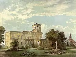 - pałac wybudowany w latach 1845-1846. Neorenesansowy pałac zaprojektowany został przez Friedricha Augusta Stülera dla braci Ryszarda i Hermanna von Roy, od 1840 właścicieli majątku[6]. Od początku XX wieku pałac był własnością rodziny de Harnier (von Harnier).