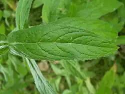 - Liście wąskie, lancetowate, długości do 7 cm, słabo ząbkowane, osadzone bezpośrednio na łodydze, niekiedy po trzy w okółku lub na bardzo krótkich ogonkach; w dolnej części łodygi naprzeciwległe, w górnej – skrętoległe. Liście odziomkowe na wyraźnych ogonkach, łopatkowate, tępe. Zwykle słabo omszone.