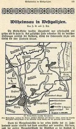 - ↑ Większość tej liczby stanowią z całą pewnością użytkownicy języka wilamowskiego, ale w austro-węgierskich spisach ludności wilamowszczyzna była klasyfikowana jako dialekt niemiecki.