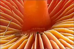 Grube, szerokie, dość gęste, szeroko przyrośnięte i zbiegające ząbkiem, początkowo czerwono-pomarańczowe, potem żółto-pomarańczowe. Ostrza blaszek żółte i gładkie[4]