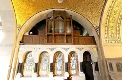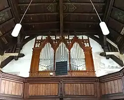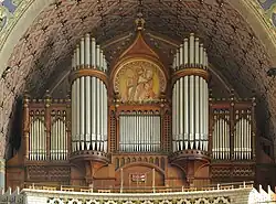 3+P | 56 | 1020 | Dźwięk tzw. fernwerku wydobywa się przez rozetę w sklepieniu prezbiterium. Organy były restaurowane w roku 1993. Jednocześnie instrument został rozszerzony o dodatkowy manuał i 12 głosów. |