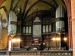 2+P | 15 | Wiatrownica mechaniczna. W roku 1911 przebudowa wykonana przez firmę Sauer. Po drugiej wojnie światowej większość piszczałek została rozgrabiona, a części mechaniczne zniszczone. W latach 1993−1994 organy zostały zrekonstruowane przez firmę Fahlberg. Podczas prac wykorzystano kilka głosów z kościoła św. Jana w Brandenburgu nad Hawelą. | |