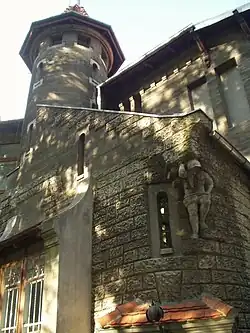 Od strony ogrodu "kuchenna" klatka schodowa w kształcie okrągłej wieżyczki. W jednym z naroży rzeźba krasnala-atlanta.