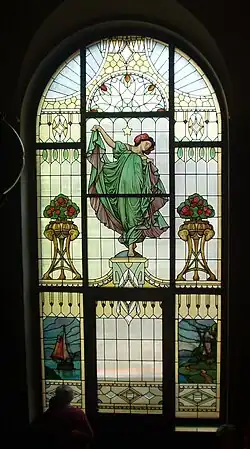 Zachowały się też oryginalne witraże: w oknie klatki schodowej, przedstawiający bosonogą kobietę w zielonej tunice i z kwiatami we włosach, jako wyobrażenie bogini poranków – Jutrzenki, o czym świadczy świecąca nad jej głową gwiazda zaranna oraz w parterowym salonie witraż z artystycznie przetworzonym widokiem na jezioro i zamek k. Montreux w Szwajcarii.