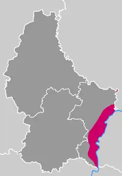 Winnice rozpościerają się 42-kilometrowym pasem na południowym wschodzie kraju, na lewym brzegu Mozeli, od Wasserbillig na północy do Schengen na południu[5][3][6][7][8][9]. Szerokość pasa upraw na nadrzecznych zboczach nie przekracza pół kilometra[6]. Prawo luksemburskie pozwala na uprawę winorośli tylko w tym pasie[5]. Wina tu produkowane mają własną apelację, jedyną w kraju: Appellation Moselle Luxembourgoise Contrôlée[10]. Po drugiej stronie rzeki znajdują się winnice niemieckie[5]. Powierzchnia upraw sięga 1300 ha[3].
