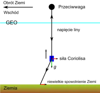 Ładunek wjeżdżający windą nabierałby nie tylko wysokości, ale również prędkości w poziomie, proporcjonalnej do odległości od środka Ziemi. Tym samym uzyskiwałby moment pędu, zabierając go Ziemi. Wciągając się po linie, pojazd ciągnąłby ją dodatkowo lekko w kierunku zachodnim (przeciwnie do jej ruchu obrotowego). Przy prędkości 200 km/h oznaczałoby to odchylenie dolnej partii liny o około 1 stopień od pionu. Naprężona lina ciągnęłaby pojazd na wschód, przenosząc tę siłę na podstawę, ciągnąc ją na zachód. Odwrotne siły działałyby przy zjeżdżaniu ładunku z orbity. W obu przypadkach naciąg liny wywołany siłą odśrodkową działającą na przeciwwagę przeciwdziałałby odchyleniu windy od pionu.