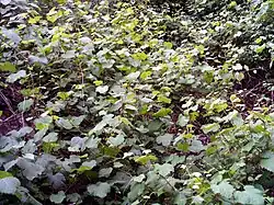 - Skrętoległe, długoogonkowe, dłoniaste i bardzo zmienne[15]. Osadzone są na zwykle nagim ogonku długości od 4 do 8 cm (rzadziej do 10 cm[14]). U nasady mają szybko odpadające przylistki[16]. Blaszka liściowa ma podobną długość i szerokość mieszczącą się w granicach od 5 do 15 cm (rzadko osiągają do 20 cm długości[14]). W ogólnym zarysie blaszka jest zwykle okrągława i na różną głębokość (zwykle dość mocno) dłoniasto klapowana[15]. Klapy są 3 lub 5, różnej wielkości, często zachodzące na siebie, a zatoki między nimi są zaokrąglone. Brzegi klap w górnej i środkowej części są grubo i nieregularnie ząbkowane, środkowa klapa jest na szczycie zaostrzona[12][15]. U nasady blaszka liściowa jest głęboko i wąsko sercowata, z klapami bocznymi często nachodzącymi na siebie. Użyłkowanie jest dłoniaste, u nasady z 5 głównymi żyłkami, każda z 4–5 parami żyłek dalszego rzędu[16]. Blaszka liściowa z wierzchu jest ciemnozielona, początkowo owłosiona, później naga. Od spodu jest jasnozielona i zwykle rzadko, kutnerowato szaro owłosiona, rzadko naga[15][14].
