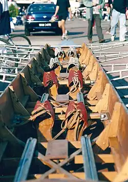 Wioślarz siedzi plecami do zasadniczego kierunku ruchu łodzi. W łodzi wioślarskiej wszystkie części nośne, w tym również osie elementów ruchomych, muszą być trwale przymocowane do kadłuba łodzi, z wyjątkiem wózka, który porusza się po szynach wzdłuż osi podłużnej łodzi. Łodzie poruszane są przy pomocy wioseł opartych w obrotowych dulkach znajdujących się na odsadniach przymocowanych do burt łodzi. Sternik w osadach ze sternikiem, w przeciwieństwie do wioślarzy, zwrócony jest twarzą w kierunku płynięcia łodzi leżąc w części dziobowej lub siedząc z tyłu.