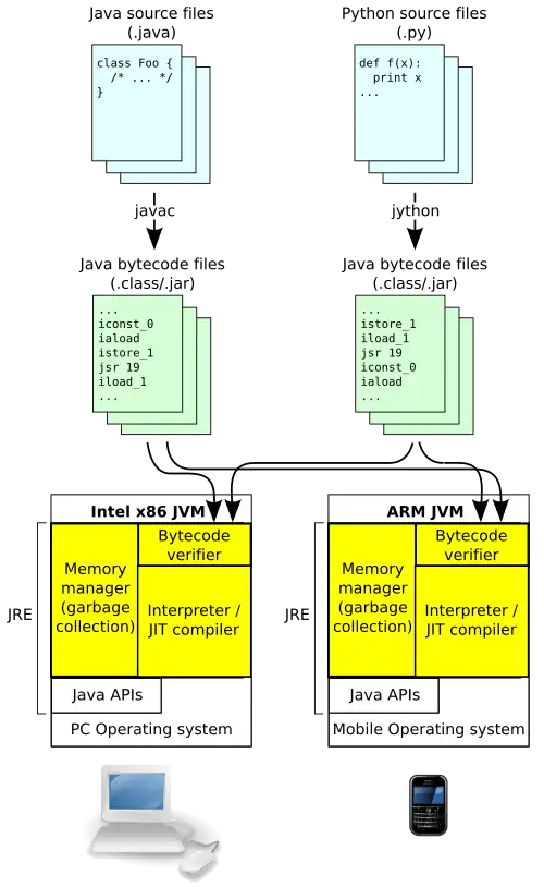 - kompilator JIT – opcjonalny komponent wchodzący w skład części implementacji, który kompiluje najczęściej wykonywane fragmenty kodu do postaci kodu maszynowego, dzięki czemu mogą być one wykonywane bezpośrednio przez procesor komputera. Pozwala na zwiększenie wydajności,
