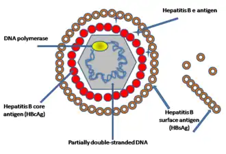 Na powierzchni osłonki znajduje się HBsAg (antygen powierzchniowy wirusa HBV; hepatitis B surface antigen), odpowiedzialny za silną immunogenność wirusa. Wewnętrzny rdzeń wirusa zbudowany jest z antygenu HBc (HBcAg; antygen rdzeniowy wirusa HBV; hepatitis B core antigen).