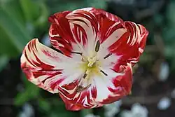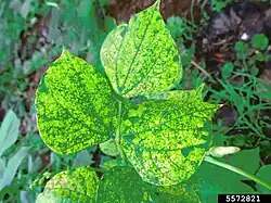 - Zmiany zabarwienia. Często są to chlorozy, czyli żółknięcia, gdy zielone części rośliny zostaje zmieniają barwę na żółtą. Czasami następuje to tylko na nerwach liści, wówczas nazywa się to przejaśnieniem nerwów lub żółtaczką nerwów (przy dużym nasileniu). Gdy na liściu powstają liczne plamy oddzielone obszarami zdrowej tkanki jest to mozaika. Gdy mozaika występuje na kwiatach, przez niektórych specjalistów określana jest jako pstrość. U roślin mających równolegle ułożone nerwy mozaika przybiera postać smugowatości lub pasiastości. Gdy zielone pozostają tylko pasma wokół nerwów, a blaszka liściowa między nerwami żółknie, jest to otaśmienie nerwów. Gdy tkanki o zmienionej barwie mają formę pierścieni, nazywa się to pierścieniową plamistością. Czasami na liściach tworzą się chlorotyczne żółte linie lub wstęgi o różnych kształtach. Są to wzory liniowe[1].