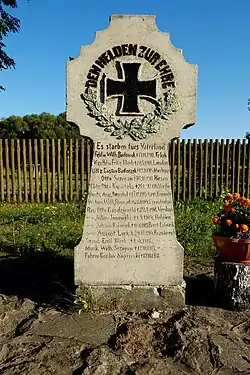 W 2007 roku mieszkańcy odnowili ustawiony po I wojnie światowej pomnik żołnierzy, którzy pochodzili tej wsi i zginęli na froncie. Znajduje się na nim napis : Es starben fürs Vaterland, a po nim są wymienione nazwiska, daty i miejsca śmierci: Wilhelm Badorrek 17.11.1917 Francja, Fritz Bloch 20.05.1918 Londyn, Gustav Badorrek 19.03.1915 Moskwa, Otto Sczepan 26.10.1918 Hirson, Otto Konieczka 21.12.1918 Verdun, August Merchel 17.12.1915 SMS „Bremen”, Wilhelm Bannach 28.11.1914 Częstochowa, Otto Gosdzienski 27.7.1916 Verdun, Julius Janowski 1.9.1914 Belgia, Johann Ksionsek 10.8.1915 Brześć Litewski, August Lork 29.10.1914 Francja, Emil Bloch 1.4.1915 Francja, Wilhelm Sczepan 17.10.1917 Francja, Gustav Napierski 17.10.1918 Francja[3].